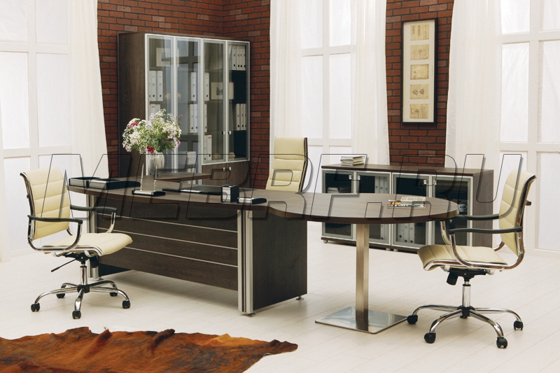КРАТКОЕ ОПИСАНИЕ: Столы, брифинги, крышки тумб изготовлены из ЛДСП  толщиной 38 мм.  Облицованы противоударной кромкой ПВХ 2 мм. Полки шкафов из ЛДСП  толщиной 25 мм, облицованы кромкой ПВХ 0,4 мм. Остальные элементы изготовлены   из ЛДСП толщиной 16 мм и облицованы кромкой ПВХ 0,4 мм. Стекло тонированное или тонированное в алюминиевом профиле. Фурнитура  производства фирмы Hettich (Германия).